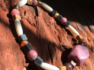 Handmade quality stretch bracelet. Rhodonite, bone hairpipe, and river stone bracelet.