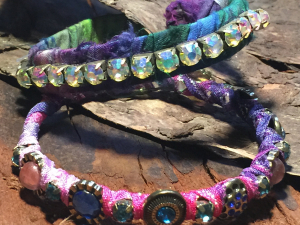Bangle bracelets recycled hand dyed sari silk, crystal, vintage brass, crystal cup chain bangle, crystal and silk