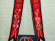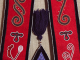The design and story of this bandolier entitled The Old Way is read in a counter-clockwise directions just like the Cherokee and many other Southeastern Woodland tribes dance. The designs allude to only a few of our time honored plants, some of which were used in ceremony for many generations. This bandolier is an homage from the artist to what tribal towns remain and how much our ancestors risked and sacrificed so that we are able to perpetuate Cherokee tradition in a safe and secure manner. It was not always this way. She hopes that this piece inspires interest or admiration for our unique culture and encourages those who see it to go support our grounds and the ways that were so hard won.
