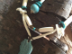 The ivory of this bone hairpipe seems a natural combination with the turquoise blue glaze on this bead and wing focal set.